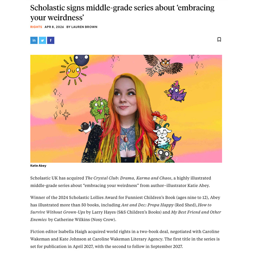 Scholastic UK has acquired The Crystal Club: Drama, Karma and Chaos, a highly illustrated middle-grade series about “embracing your weirdness”. Katie’s work is going from strength to strength and her ever increasing popularity is so well deserved. As the winner of the 2024 Scholastic Lollies Award for Funniest Children’s Book (ages nine to 12), Abey has illustrated more than 50 books. She is now writing as well, further proving her incredible talent.